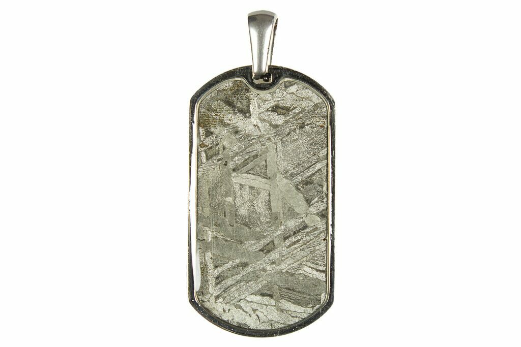 These are unique, "dog tag" pendants made out of slices of authentic iron meteorites. It comes from the Aletai meteorite fall discovered in the Xinjiang region of China. The meteorite slices have been acid etched to reveal the fascinating crystallization patterns within the meteorite. This slice has been sealed in acrylic to prevent rusting. The pendant comes with a 24", sliver plated snake chain to complete the necklace. The pendants measure 1.35 x .75"