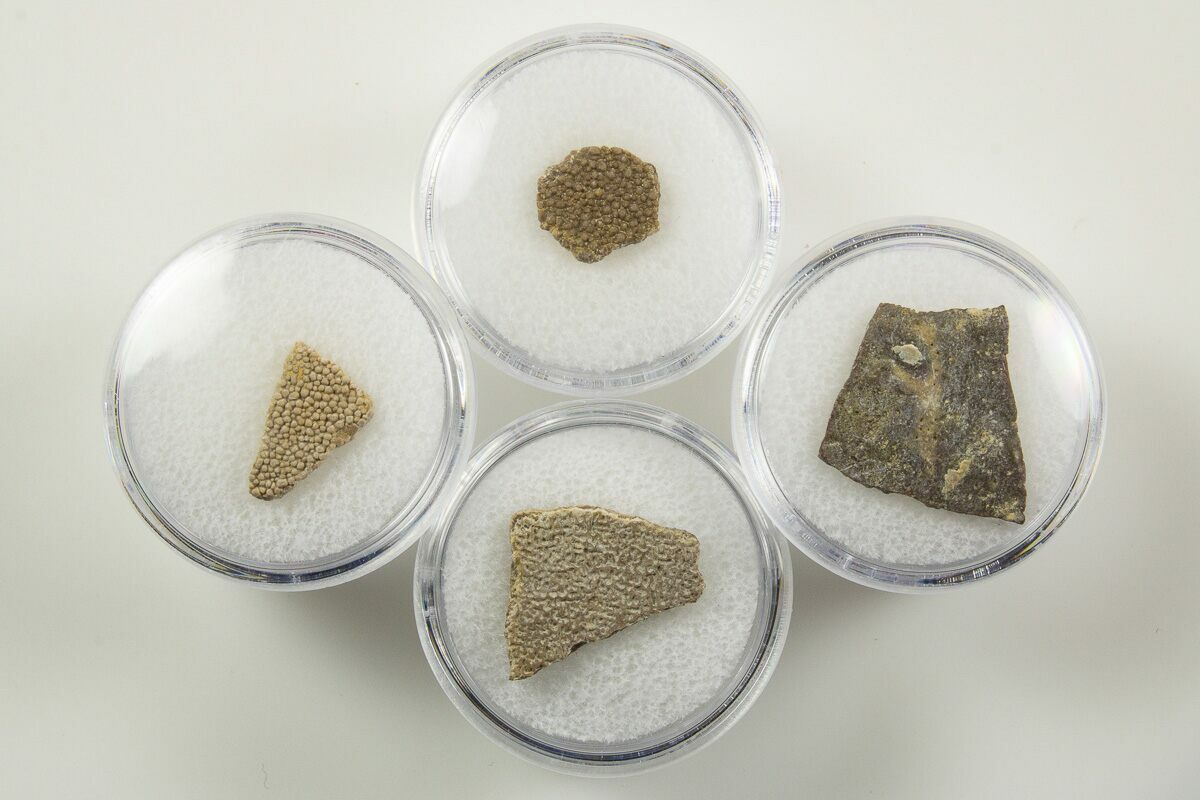 These are incredibly interesting egg shell fragments, collected from a Late Cretaceous (Maastrichtian Stage) aged deposit in Meze, Southern France. Egg shells from Meze are much more uncommon than those of the same age found at Aix-en-Provence, France. The shells belong to the dinosaur oogenera Megaloolithus and Cairanoolithus.