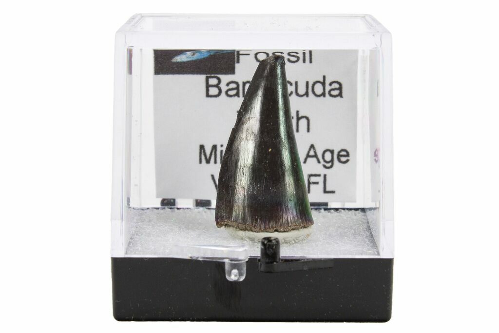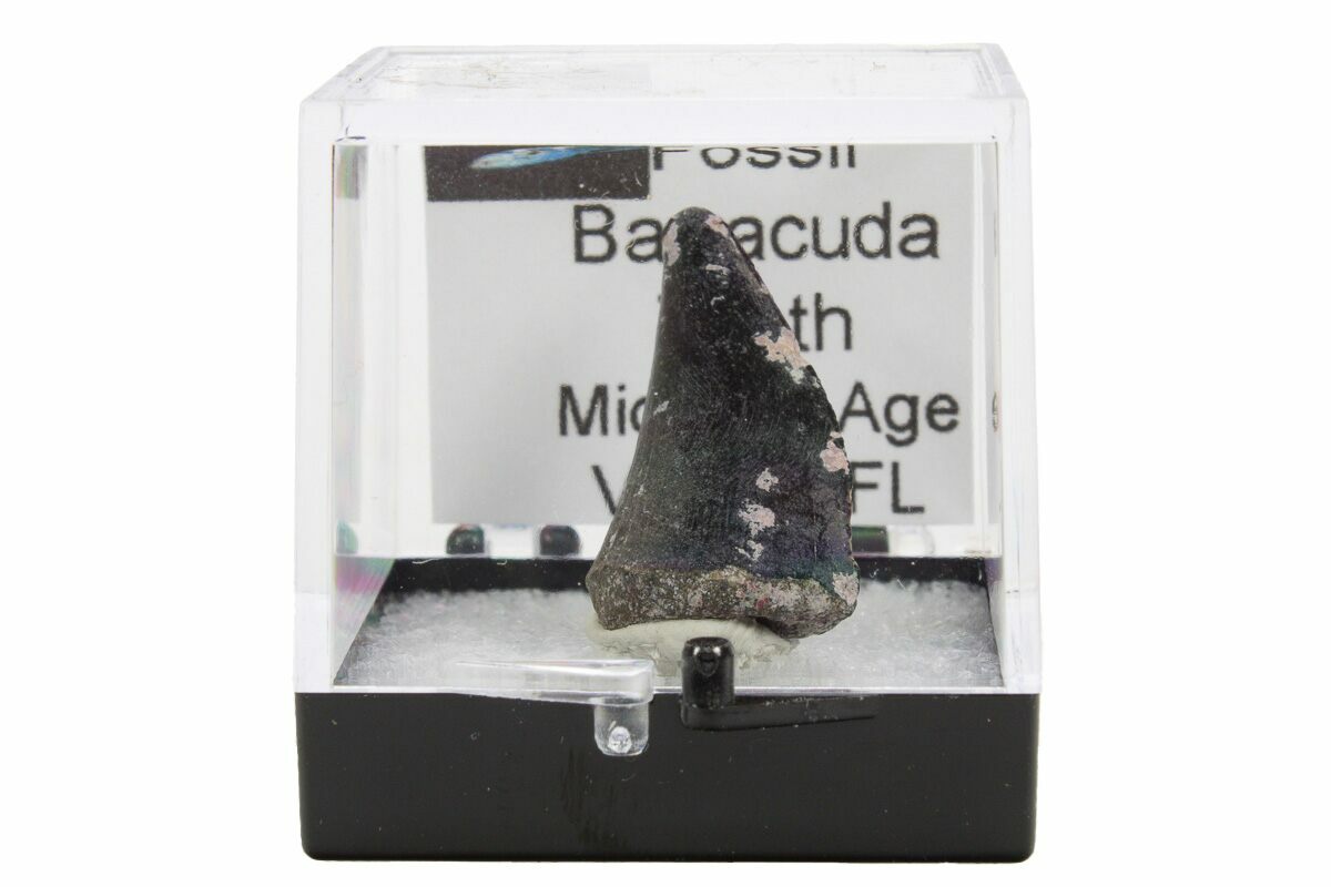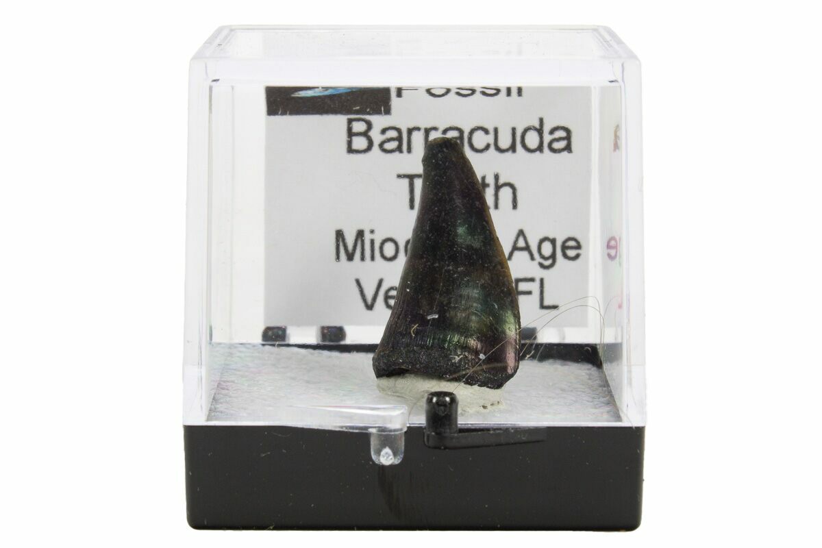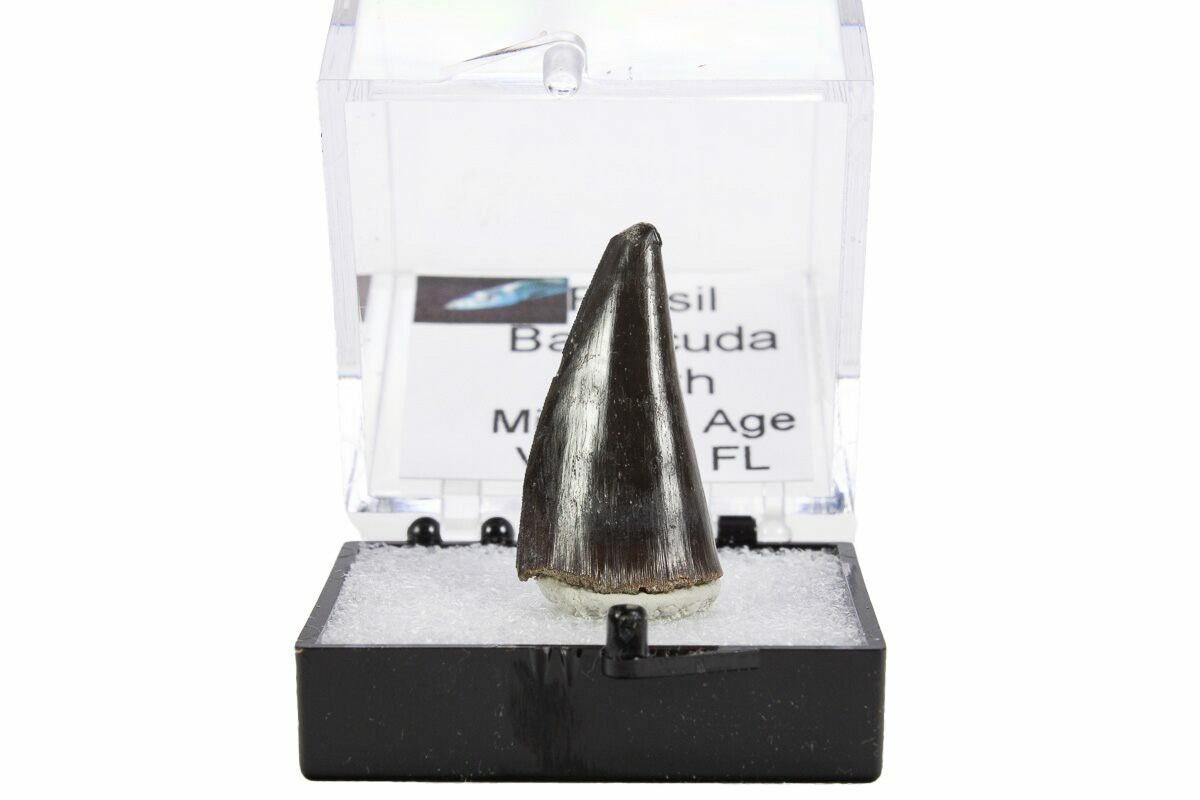 These are fossil barracuda (order Perciformes - family Sphyraenidae) teeth collected from Venice, Florida. These teeth are Miocene in age and measure between 3/4" and 1" long, with most in the middle of that range. The photos are representative of the fossil(s) you will receive but don't picture the exact ones. Each tooth is accompanied by an acrylic perky hinge display case.