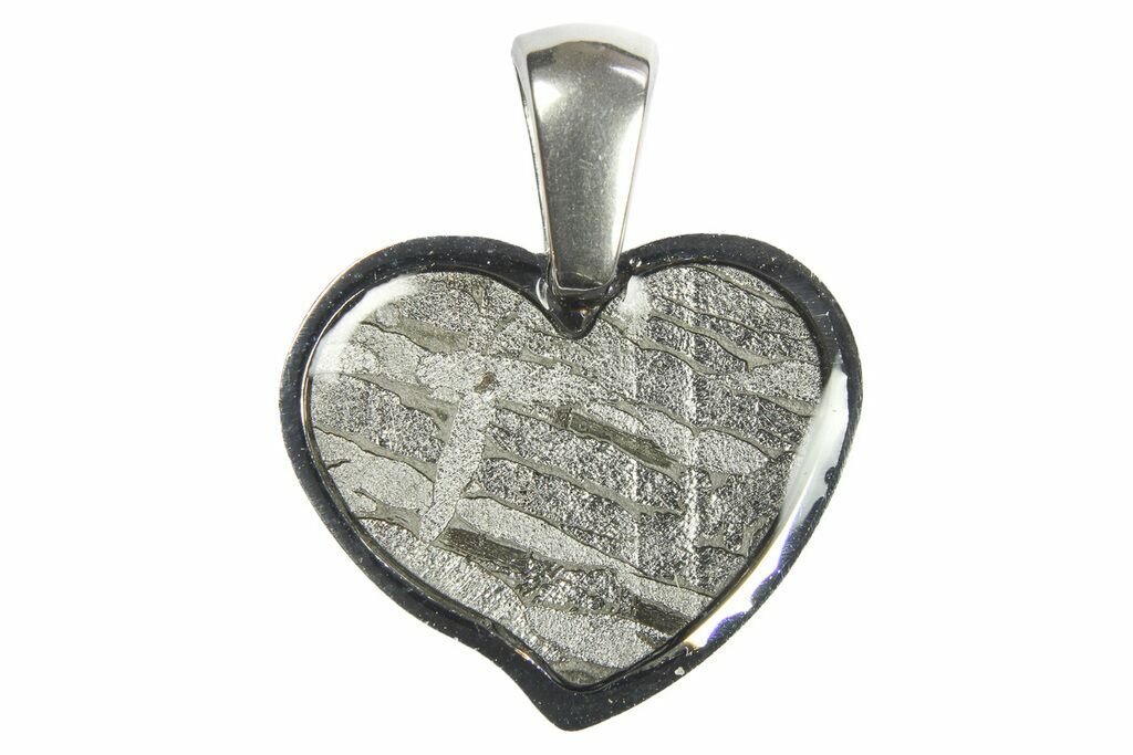These are unique pendants made out of slices of authentic iron meteorites. It comes from the Aletai meteorite fall discovered in the Xinjiang region of China. The meteorite slices have been acid etched to reveal the fascinating crystallization patterns within the meteorite. This slice has been sealed in acrylic to prevent rusting. The hearts are .62" wide. The pendant comes with a 24", sliver plated snake chain to complete the necklace.