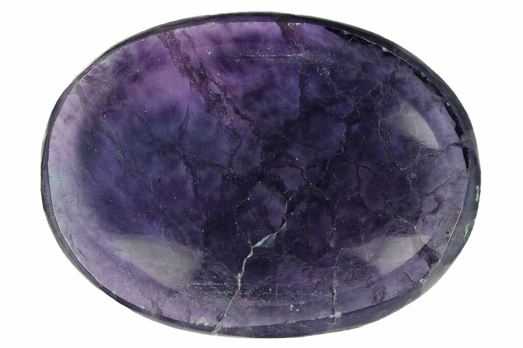 These are small, polished, purple fluorite worry stones. Each stone has some variety in color and pattern, with some specimens having blue, yellow, and/or green banding. They average 1.5" wide, but are hand polished so some maybe slightly larger or smaller.