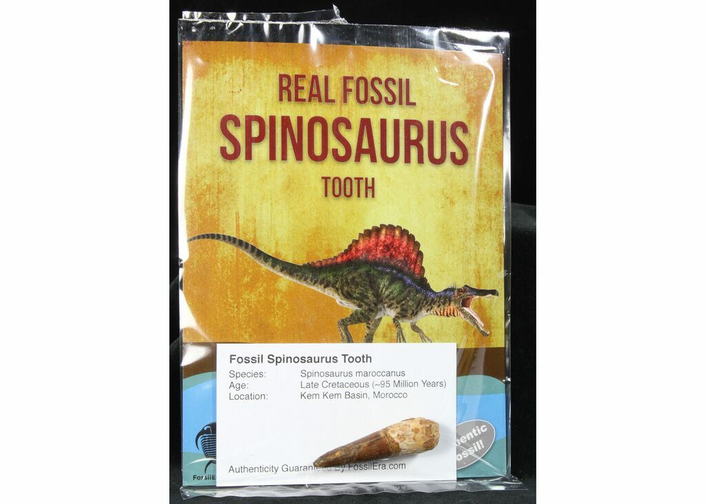 Each fossil Spinosaurus tooth comes nicely packaged along with an information card and authenticity guarantee.