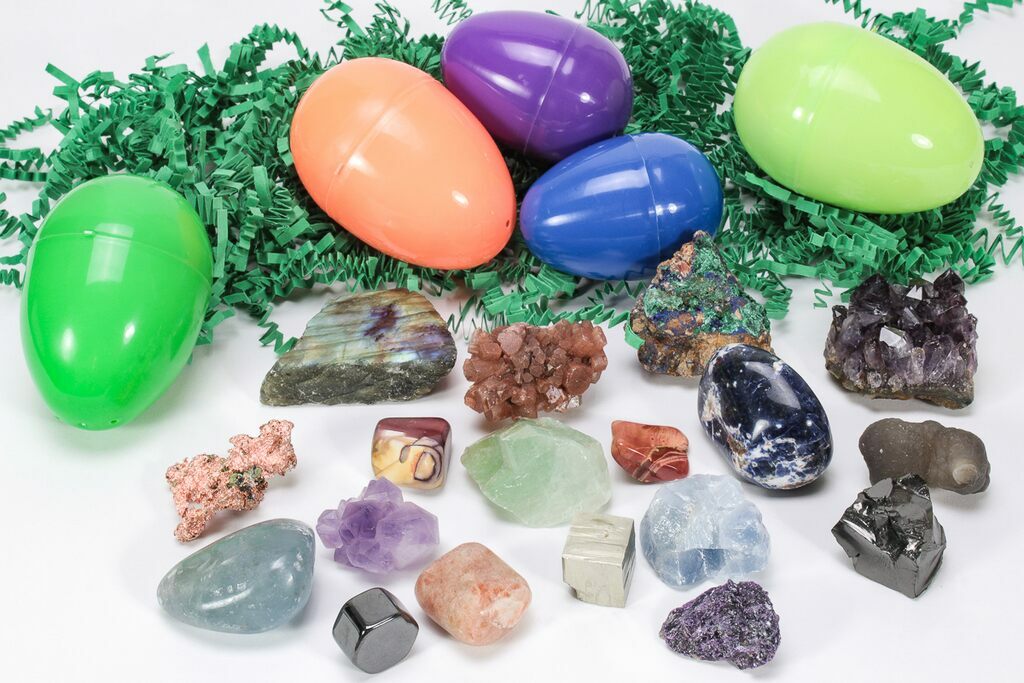 Includes THREE eggs, each one with a different mineral, polished rock, or crystal inside. With every specimen there is an identification card inside the egg which lets you know what it is and where it was found. A perfect Easter surprise for kids.