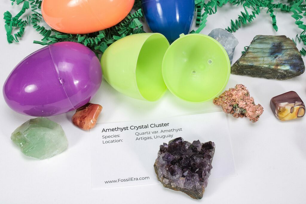Includes SIX eggs, each one with a different mineral, polished rock or crystal inside. With every specimen there is an identification card inside the egg which lets you know what it is and where it was found. A perfect Easter surprise for kids.