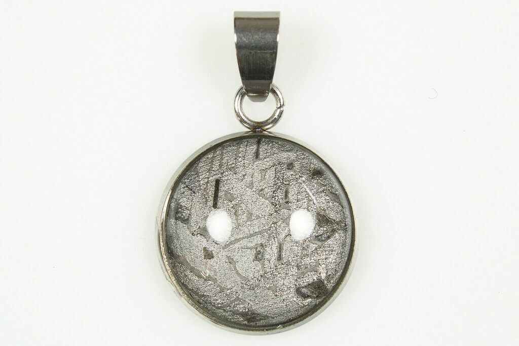 These are unique pendants made out of slices of authentic iron meteorites. It comes from the Aletai meteorite fall discovered in the Xinjiang region of China. The meteorite slices have been acid etched to reveal the fascinating crystallization patterns within the meteorite. This slice has been sealed in acrylic to prevent rusting. The pendant comes with a 24", sliver plated snake chain to complete the necklace.