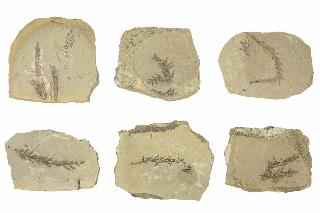 These are fossil Dawn Redwood (Metasequoia occidentalis) branches from the Muddy Creek Formation of Beaverhead County, Montana. Each of these detailed fossils is on a thin piece of tan colored shale. The exact size of the pieces varies, but most of the pieces are 2 to 2 1/2" across. The photos are representative of the fossils you will receive but don't picture the exact ones. Quantity discounts are available.