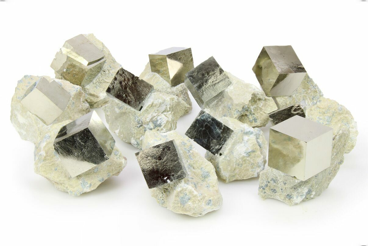 At first glance some people assume that these pyrite cubes are man-made, but the amazing thing is that they are natural! Pyrite from this location is famous for its beautiful shine, near-perfect cubic formation, and sculptural appearance. Because the matrix rock is soft, the cubes often come loose during collection. Care is taken during preparation to stabilize, repair, and make sure everything is remounted in its natural position: no specimens are composites. This means that nearly all of the pyrite cubes still in the rock from this locality have been remounted, and most clusters of multiple cubes have been stabilized.