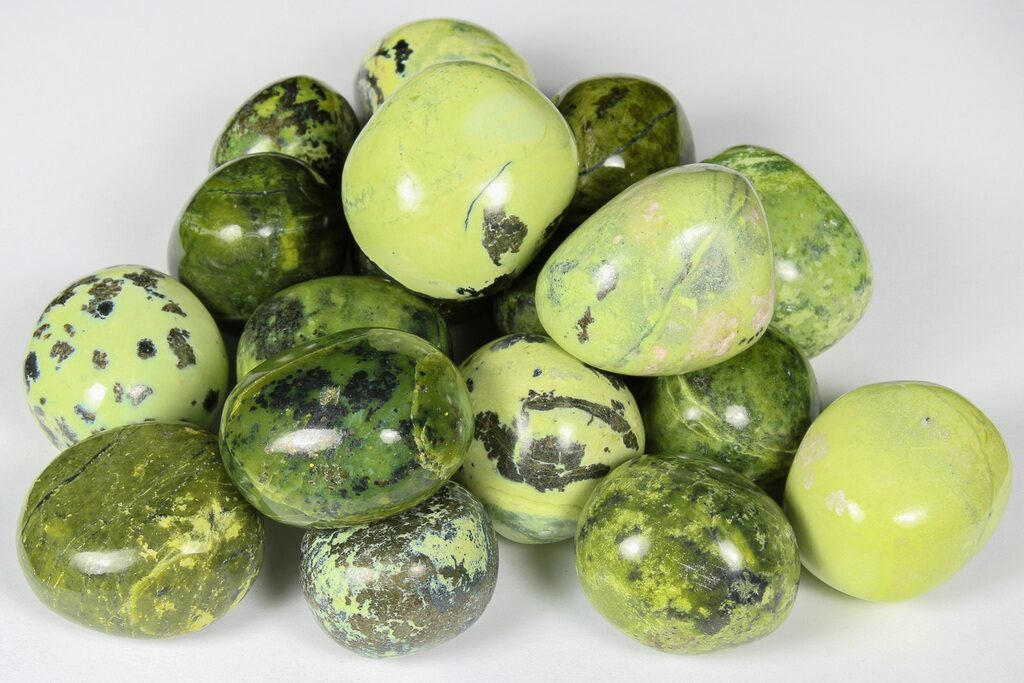 These are large tumbled (polished) serpentine stones. The photos are representative of the specimen(s) you will receive. They range from approximately 1 to 1.3" wide. Quantity discounts are available.
