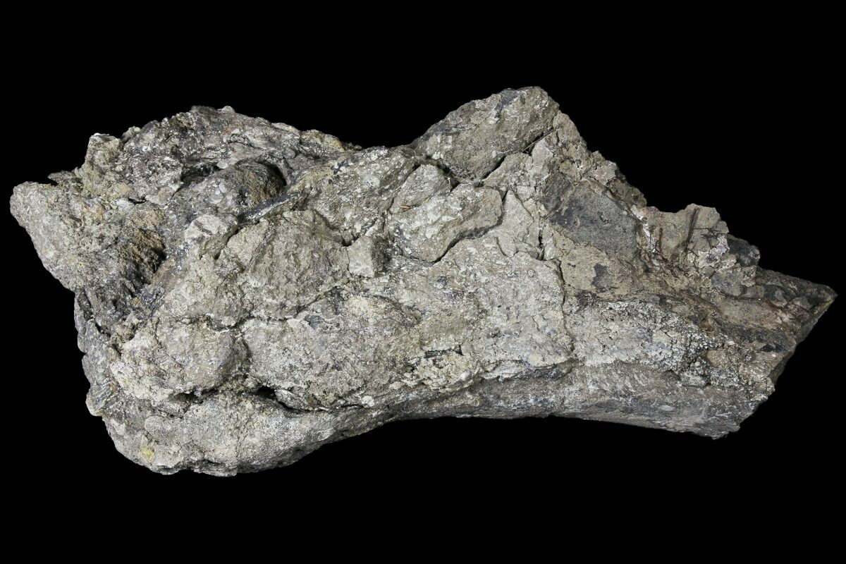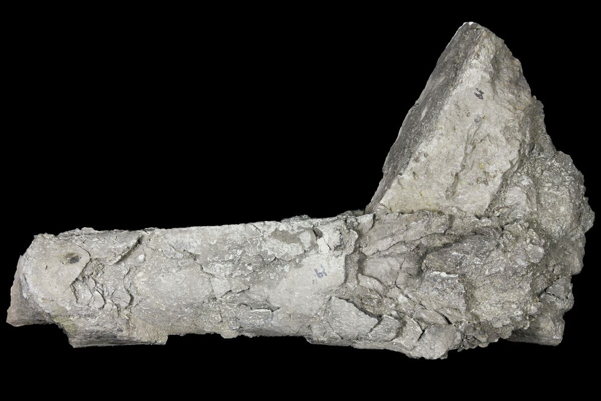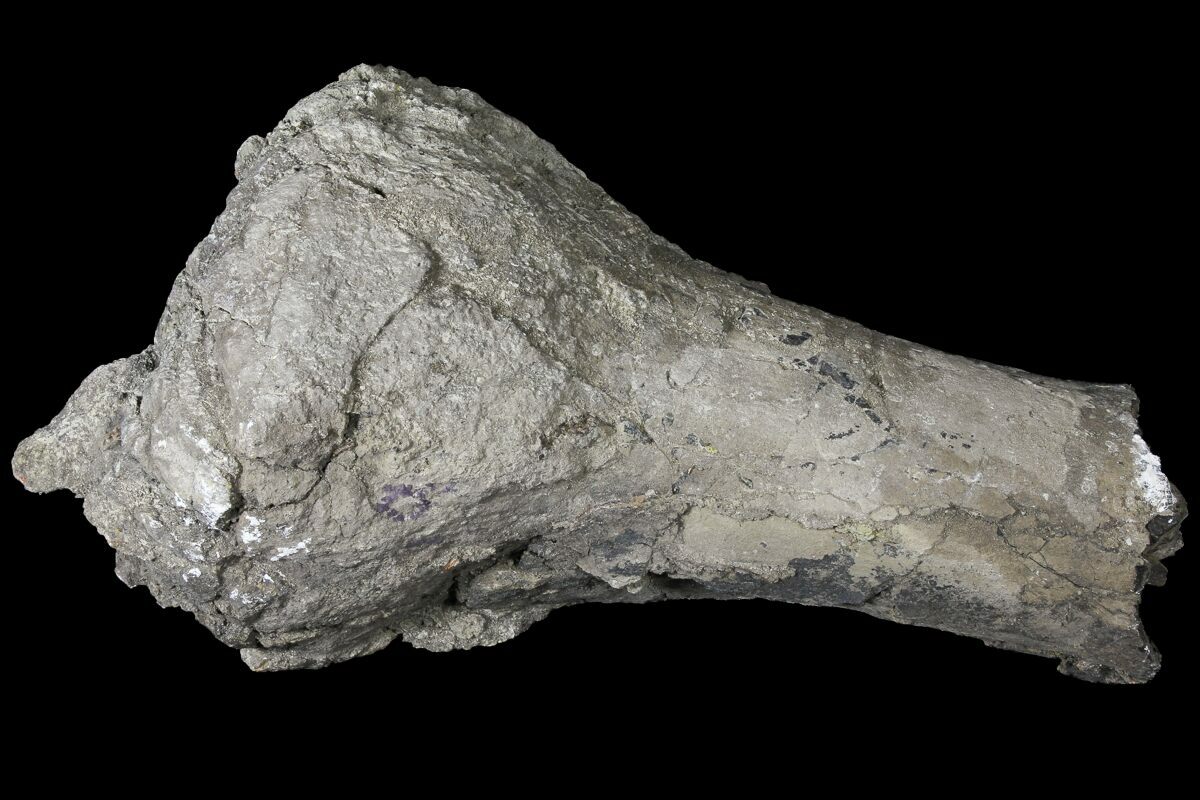 This is a partial, unprepared, fossil stegosaurus femur from the Morrison Formation of Colorado. It is approximately 60%-70% of the bone and is in five main pieces. The largest section is 22.6". The length of the bone when reassembled would be in the range of 40"-45". It has some repairs but is largely unprepared. It is being sold as is and would make a great opportunity to do the preparation yourself. It would also make a nice display of how bones look when they are found. It will arrive with all the field markings and labels still attached.